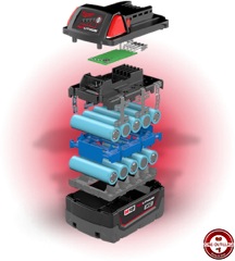 La batterie RedLithium-ion 2.0Ah et 4.0Ah dispose de la gestion électronique individuelle des cellules pour une durée de vie accrue et une autonomie incomparable, une gestion des cellules individualisée qui permet de charger toutes les cellules individuellement. Le système d’assemblage robuste (cage en métal usinée en une seule pièce, cadre rigide, soudures doubles, antivibrations…). Des batteries hautes performances qui peuvent travailler efficacement jusqu’à –18°C. Un détail très appréciable pour les artisans qui stockent les outils dans des conteneurs ou dans leur véhicule en hiver.