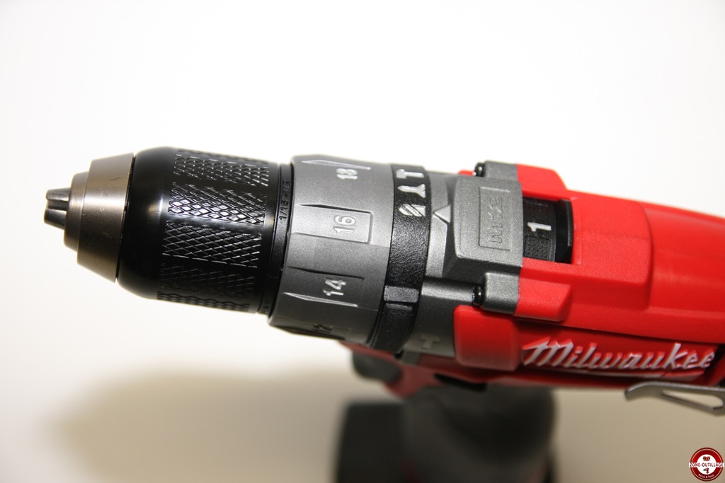 La bague de réglage de couple 18 positions est bien proportionnée. L’outil dispose de 3 modes : perçage, perçage avec percussion et vissage. Le changement de mode s’effectue par une simple rotation de la bague noire qui présente la particularité d’avoir deux ergots munis de grip. Un véritable plus car d’une part il facilite la manipulation de l’outil et d’autre part, il permet à l’outil de ne pas glisser lorsqu’il est posé sur une surface inclinée.