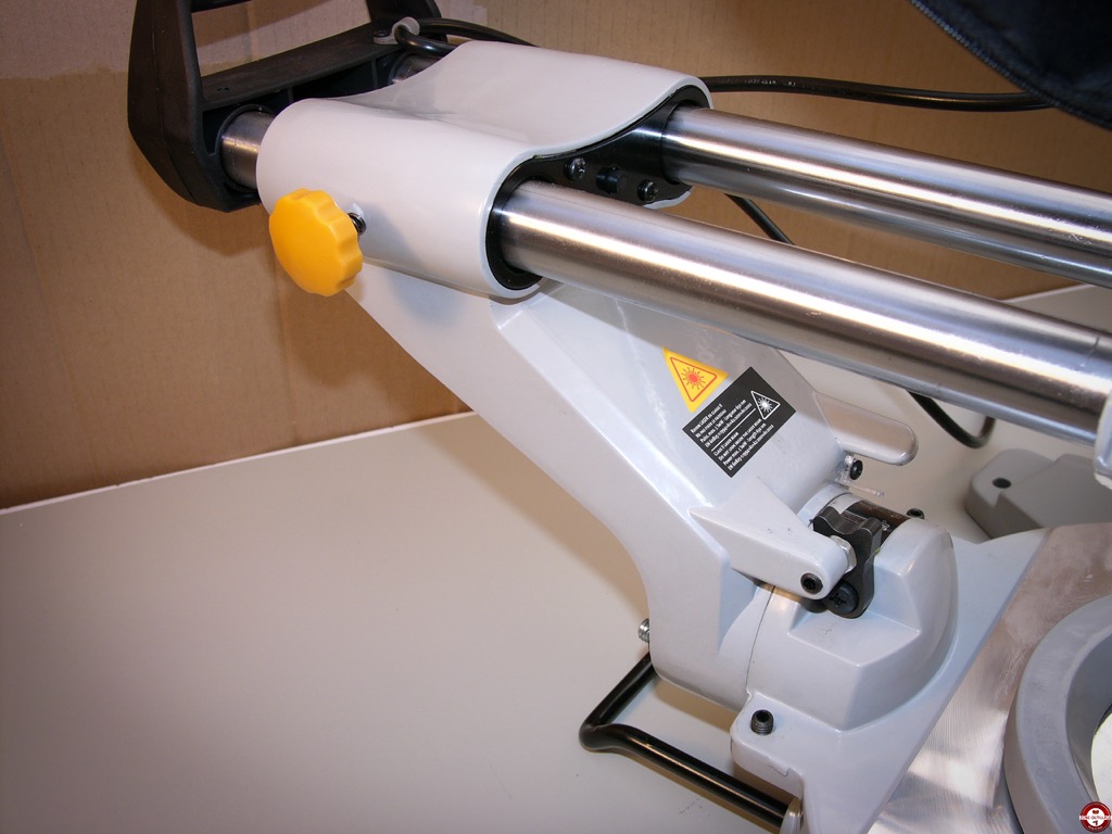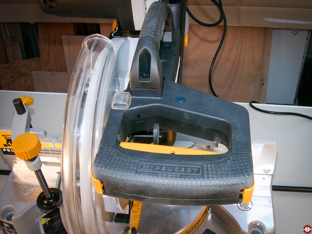 Le petit bouton jaune à droite permet de verrouiller/déverrouiller l’articulation de la scie dans le plan vertical.On voit également le cache de la courroie de transmission et la poignée de transport.