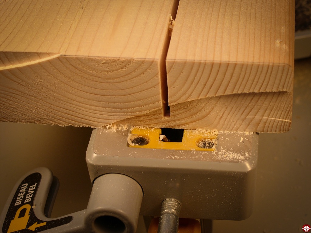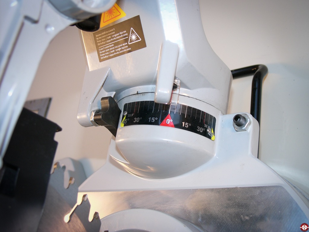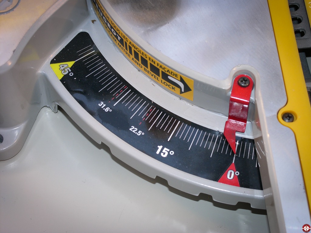 L’articulation de l’angle de coupe en biseau. Les graduations sont matérialisées par un autocollant et comme on peut le voir la visée n’est pas des plus pratique à cause de la butée des 45°.