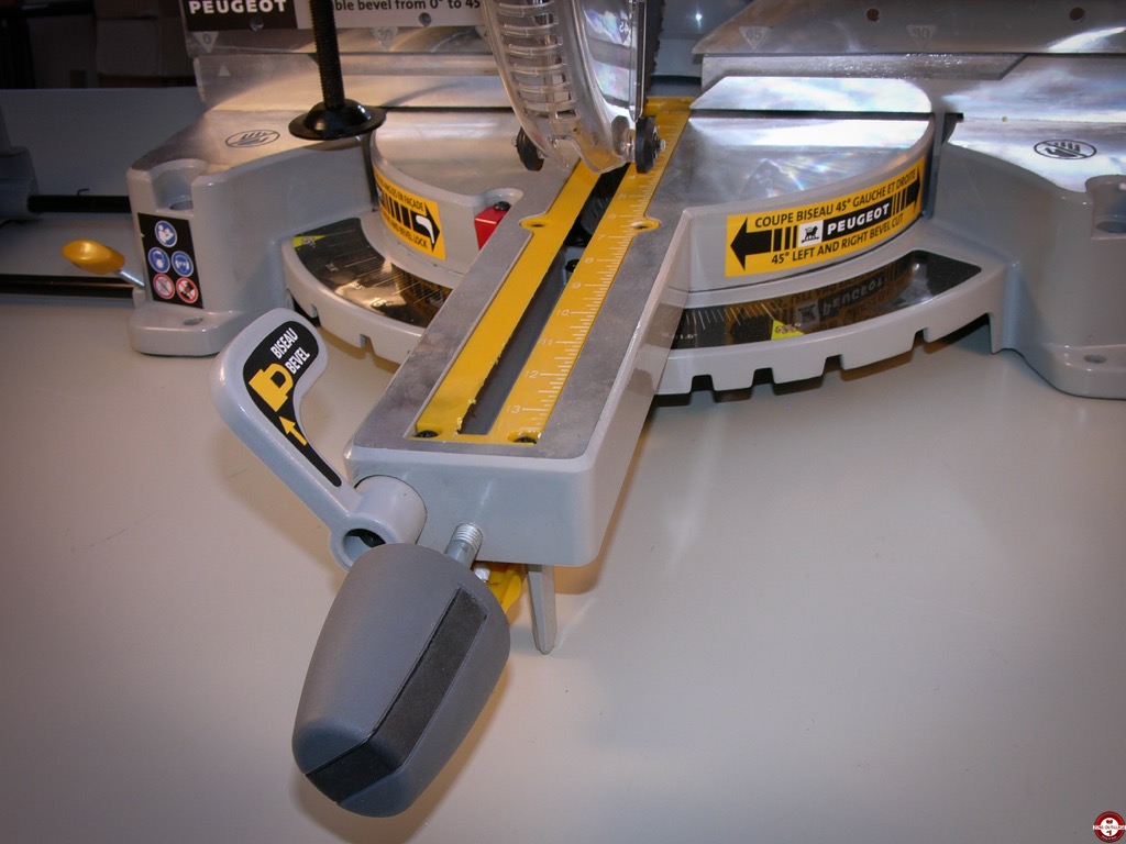Sur l’avant, le levier de blocage de l’angle de coupe en biseau et la grosse molette caoutchoutée qui sert à bloquer l’angle de coupe d’onglet.