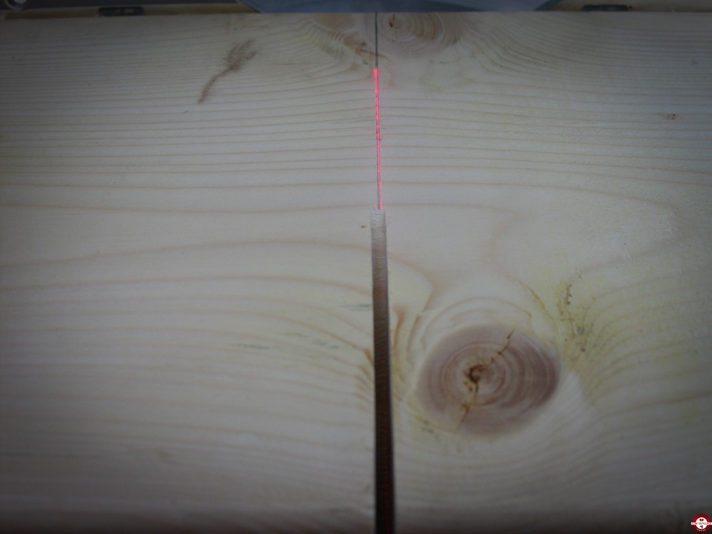 Le laser indique le centre de la lame et encore pas tout à fait, inutilisable donc.Les premiers essais de coupe sur des tablettes en pin donne des résultats dont même une scie sauteuse serait en mesure d’exécuter cette action avec plus de précision.