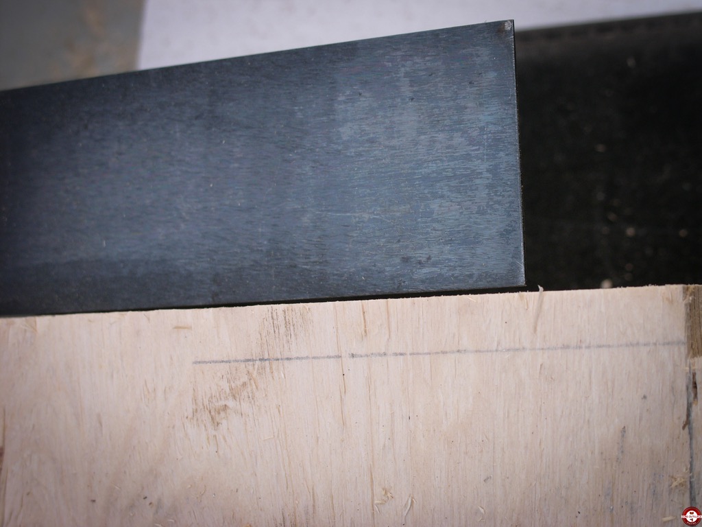 Deuxième essai de coupe droite sur du bois massif, déception totale, la coupe est irrégulière, la lame laisse des traces de peinture noire et aucun équerrage n’est bon.