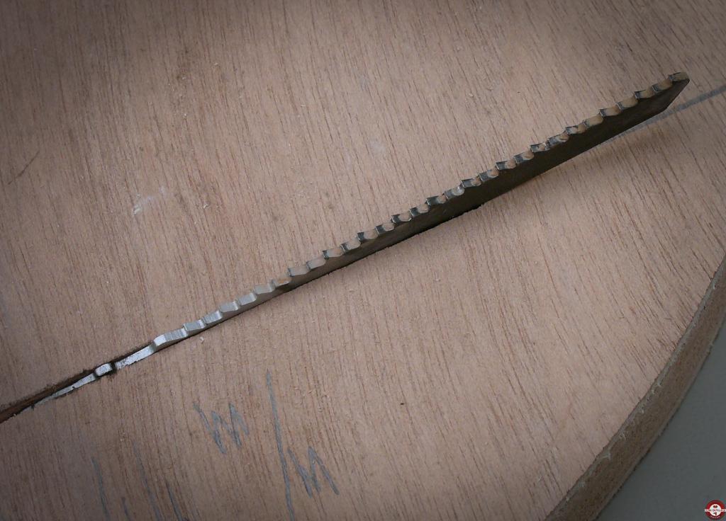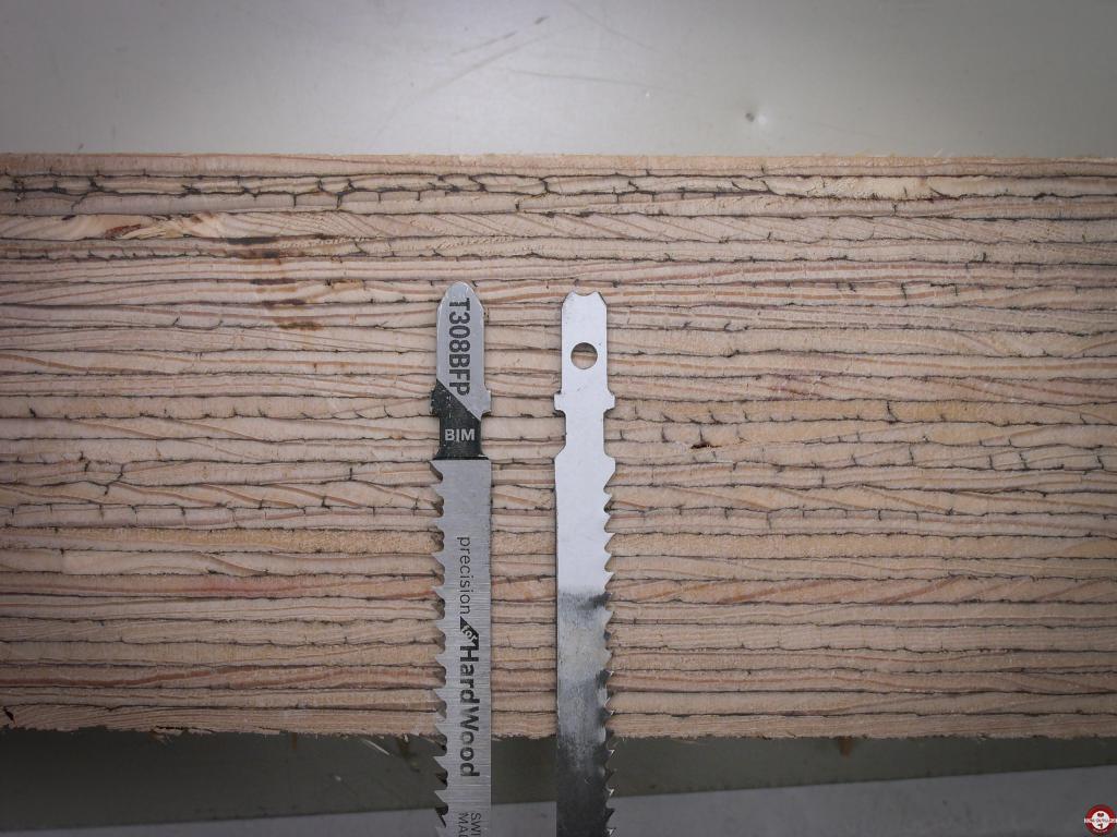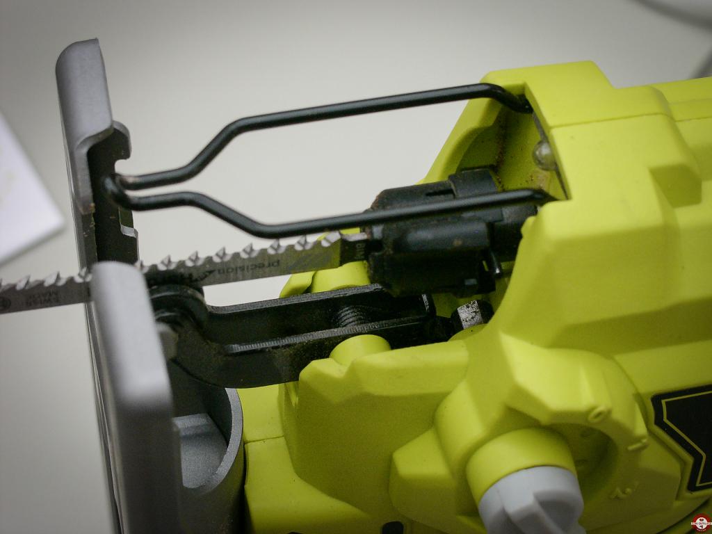 Au bout de quelques sciages, la lame d’origine présente des signes évidents d’usure. Nous essayons de la remplacer par une neuve de meilleure qualité d’une autre marque pour constater qu’elle ne se verrouille pas totalement, car les lames Ryobi ont la partie supérieure évidée et des ergots plus petits.