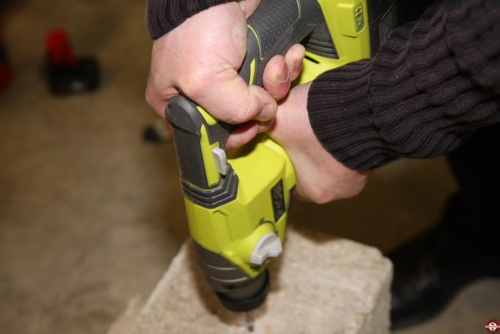 Le marteau perforateur Ryobi R18SDS a été testé à la suite d’un banc d’essai de marteau perforateur sans fil professionnel 18 V. Pour le coup, il a subi les mêmes tests avec des diamètres de perçage les plus courants (6 mm, 8 mm et 10 mm). Nous avons utilisé des forets Milwaukee MS2 et 4 taillants. Tous nos tests de perçages sont positifs, la machine fait bien son travail. Les 1,2 Joules couplés à la fréquence de frappe de 6600 cps/min permettent une progression rapide dans le béton.