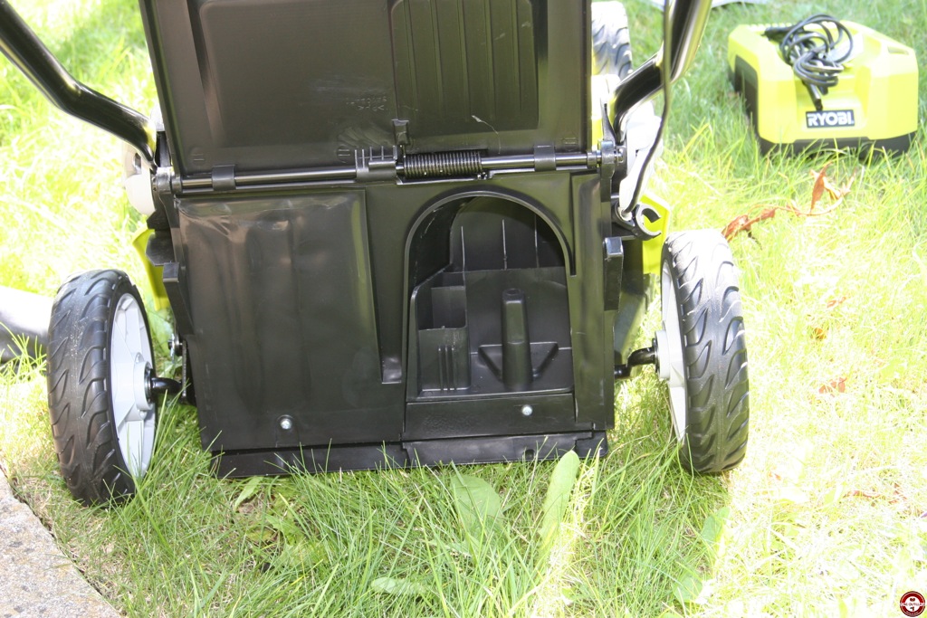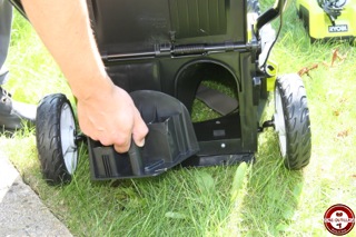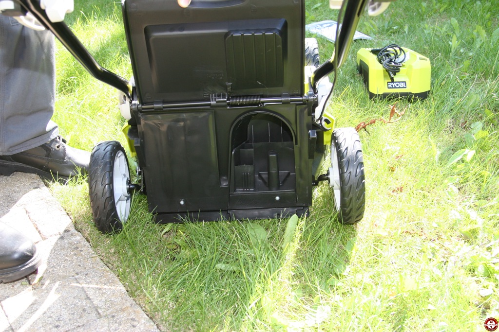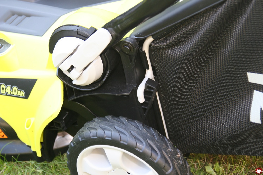 L’avantage de cette tondeuse Ryobi est qu’elle fonctionne uniquement sur batterie. Vous ne vous encombrez pas avec un fil électrique, pas de mélange à faire. Il suffit d’engager la batterie dans l’emplacement prévu, mettre la clé de sécurité et la tondeuse est prête à l’emploi. Nous avons testé la tondeuse RLM36X40H sur une surface de 400 m². Dans un premier temps, nous avons testé avec le panier de récupération. Le réglage de hauteur de coupe se fait d’une main. La mise en marche de la tondeuse s’effectue en deux étapes. Une première pression sur l’interrupteur puis sur l’un des 4 boutons situés sur la poignée ergonomique. Le moteur se met en marche progressivement, il est très peu bruyant 94(Db). Les roues arrière de la tondeuse sont montées sur un roulement un bille et avec son faible poids, les déplacements et les changements de direction ne demandent pas beaucoup d’efforts. Le panier souple de 50L se place et se manipule facilement.