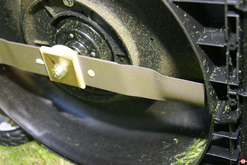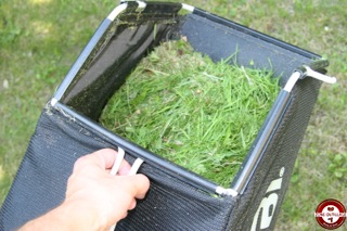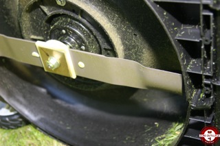 Dans un deuxième temps, nous avons testé en mode mulching sur la même surface. Ce mode écologique, pratique et économique, est de plus en plus employé sur les petites et moyenne surface. Le mulching est une technique de tonte sans ramassage de l’herbe. La tondeuse coupe l’herbe tondue en infimes parties qui sont redéposées sur la pelouse. Pour utiliser ce mode, il suffit d’enlever le panier de récupération et d’insérer le déflecteur fourni à l’arrière de la tondeuse.