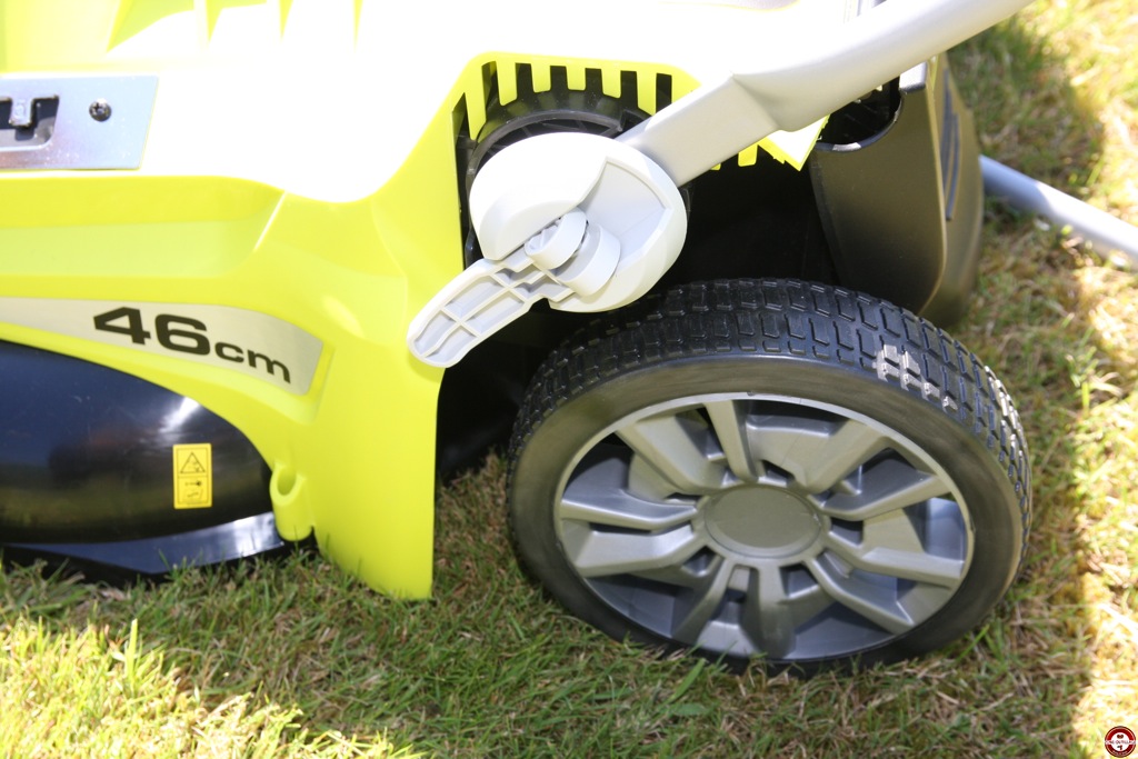 Les grandes roues de la tondeuse sans fil Ryobi facilitent les déplacements, mais elle n'est pas auto-tractée.