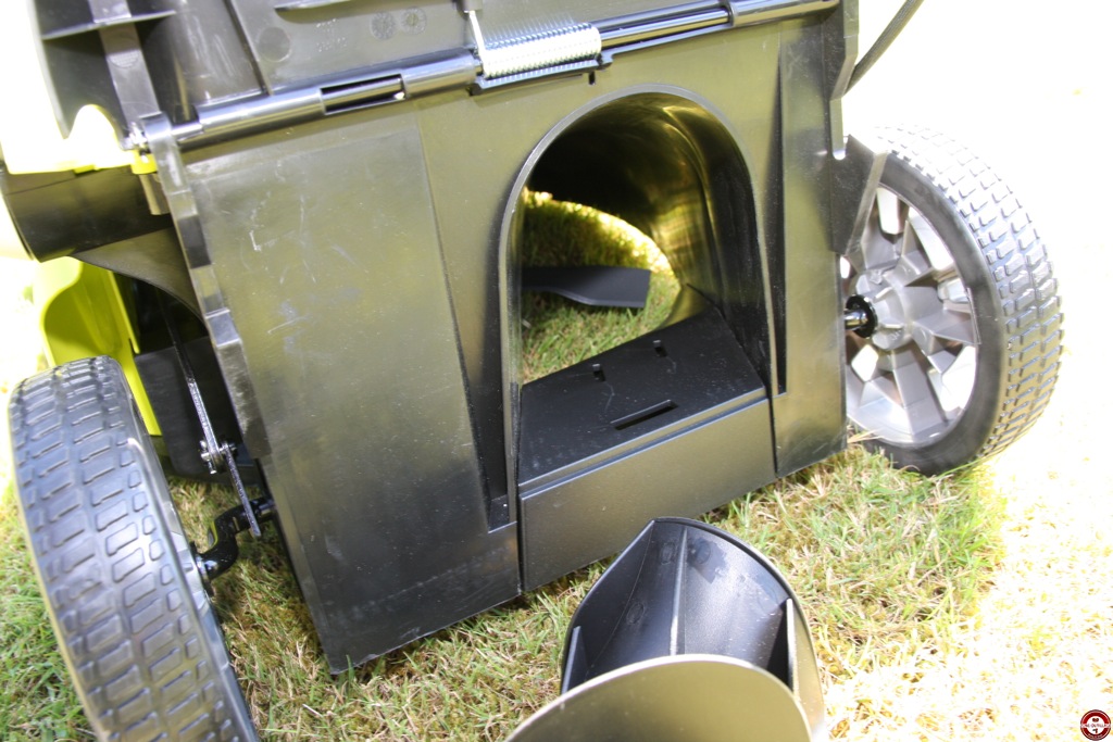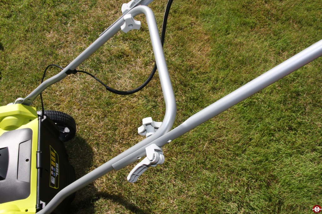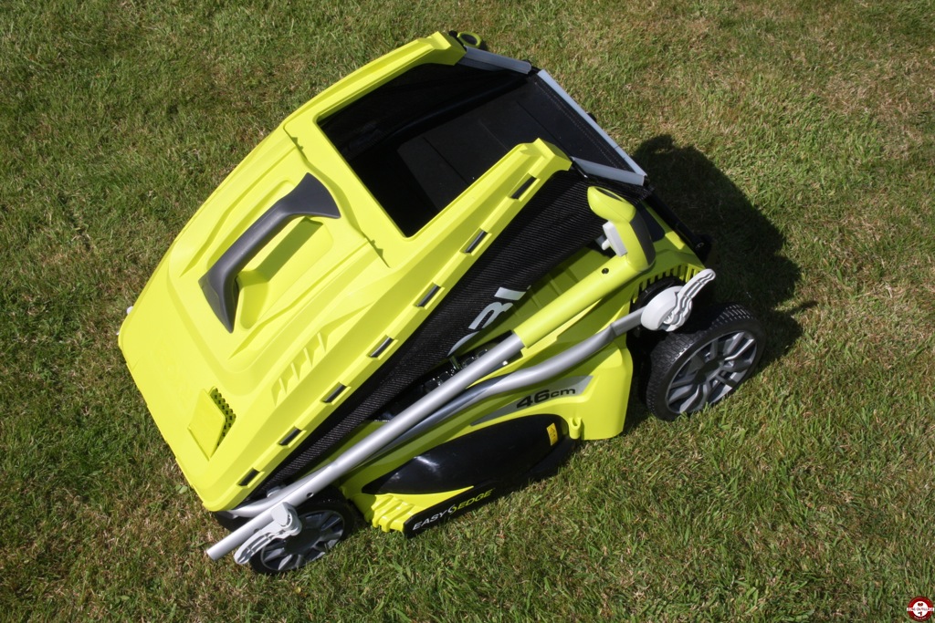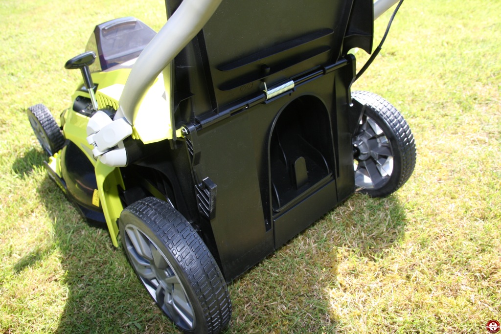 Les 46 cm de largeur de coupe offrent un bon rendement que l’on peut comparer à une tondeuse thermique, mais le bruit et les gaz d’échappement en moins. Avec le bac de ramassage, nous avons tondu une herbe haute et humide en deux temps. Dans un premier temps en coupe haute et dans un second temps une coupe plus basse, la tondeuse fait bien son travail, l’herbe est bien dirigée vers le bac de ramassage. Le système de bac semi-rigide est nettement plus simple à vider qu’un modèle rigide. Enfin la tondeuse sans fil RYOBI est équipée sur chaque côté d’un rabatteur d’herbe que nous avons testé le long d’un mur et au ras d’un massif de fleurs, les résultats sont satisfaisants. La tondeuse RYOBI est très maniable, mais il faudra un minimum d’efforts pour pousser les 19 kg de la machine.