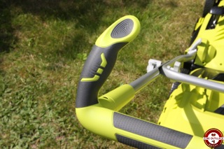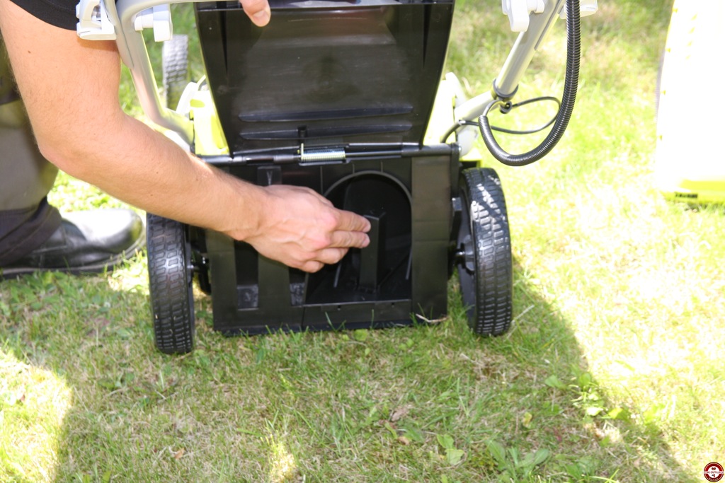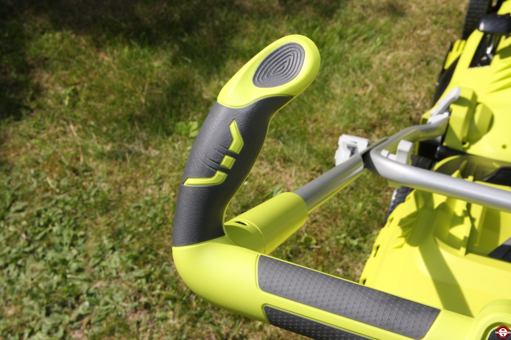 La tondeuse RYOBI est relativement légère (17 kg sans batteries), une poignée sur le dessus permet à l’utilisateur de la déplacer facilement. Enfin après l’utilisation, le guidon se replie complètement et le bac de ramassage semi-rigide se positionne sur le dessus. La rangement de la machine est optimisé pour un gain de place maximal.