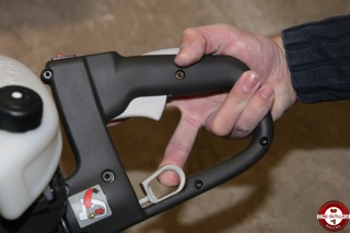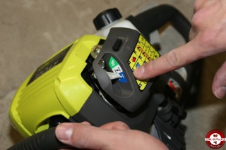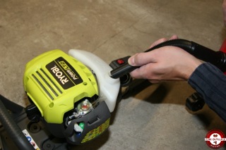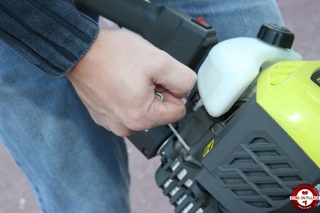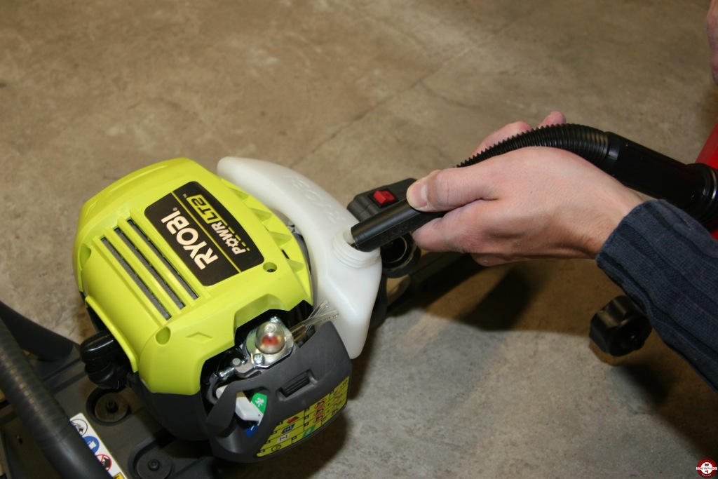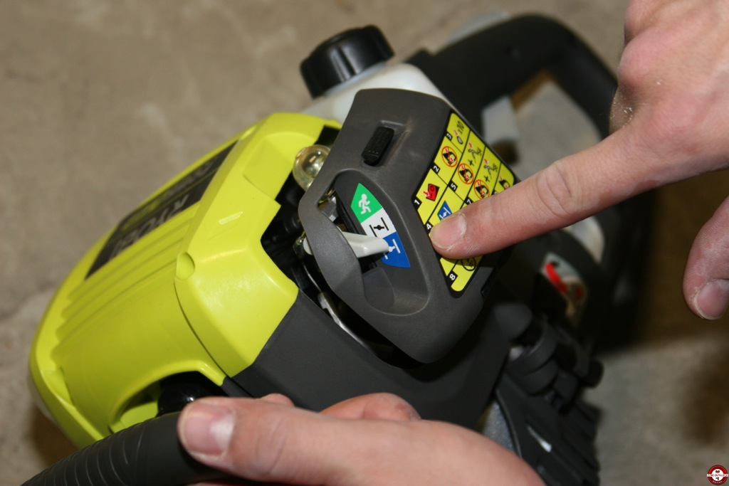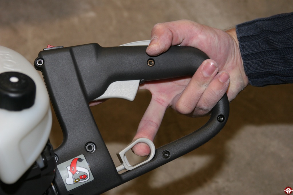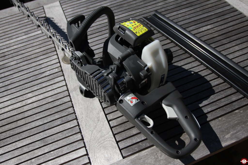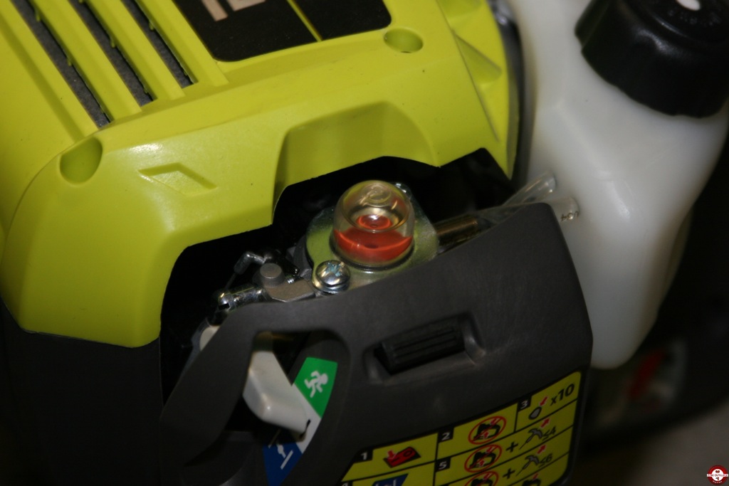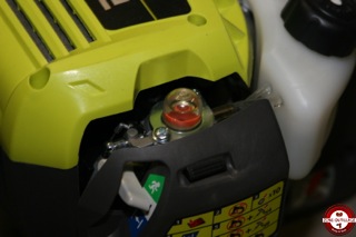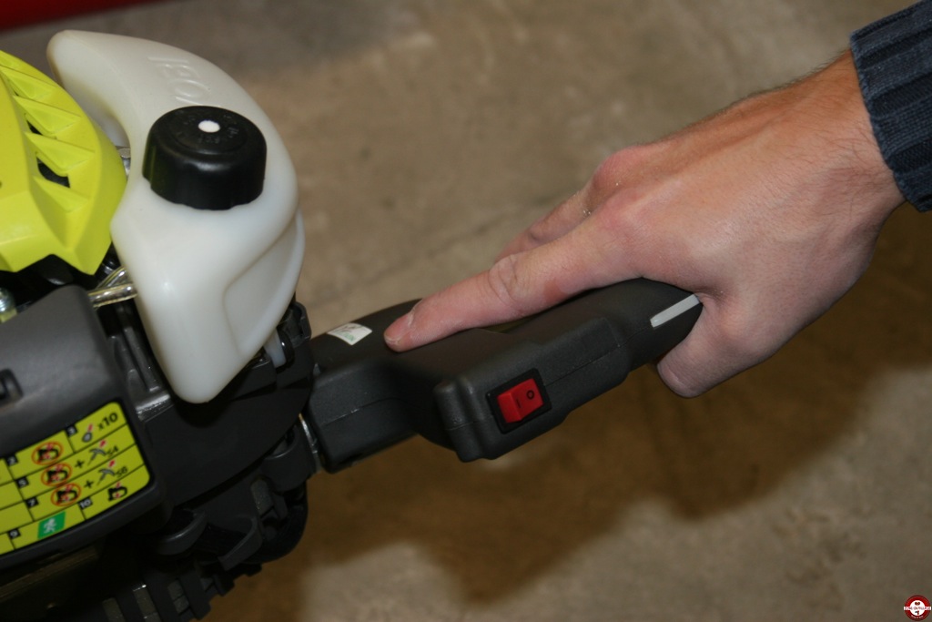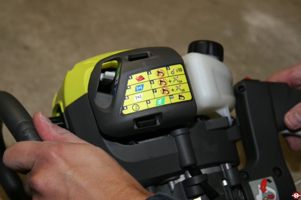 Après avoir effectué un mélange comme le préconise le constructeur (50:1 soit 2 %) nous avons suivi les instructions de démarrage qui sont situées sur le côté de la machine. Son démarrage à froid est simplifié grâce à une pompe d’amorçage du circuit de carburation qui permet de gaver rapidement, par simple pression du pouce, le carburateur en carburant avant la mise en route du moteur. Cela permet de réduire ainsi le nombre de cycles de lancement lors de la première utilisation ou après de longues périodes de non-utilisation.