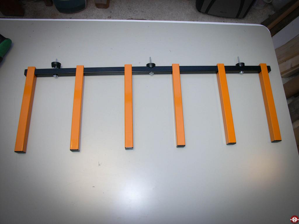 L’étagère se compose de deux montants verticaux en tube d’acier carré de 25 mm laqués noir, douze traverses en tube d’acier carré de 30 mm laqués orange, six rondelles en plastique d’espacement, douze vis à tôle de butée et un mode d’emploi. Des bouchons en plastique noir sont déjà fixés aux extrémités des différents éléments métalliques et Triton annonce une peinture par poudrage.