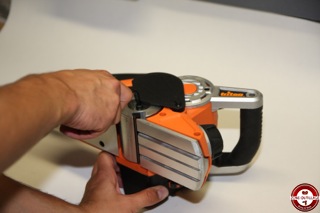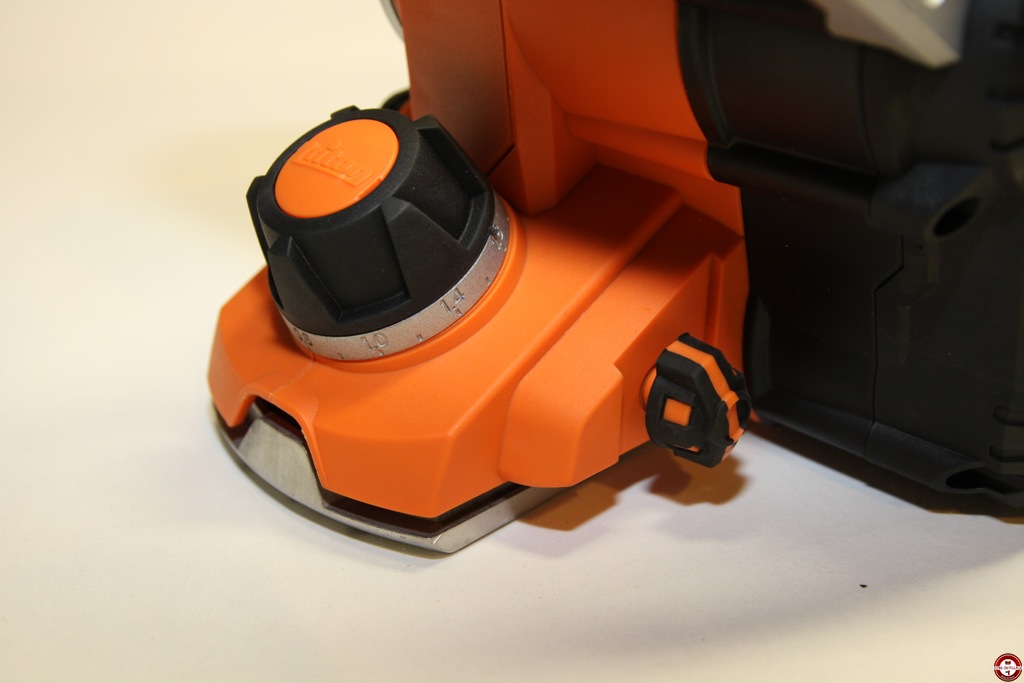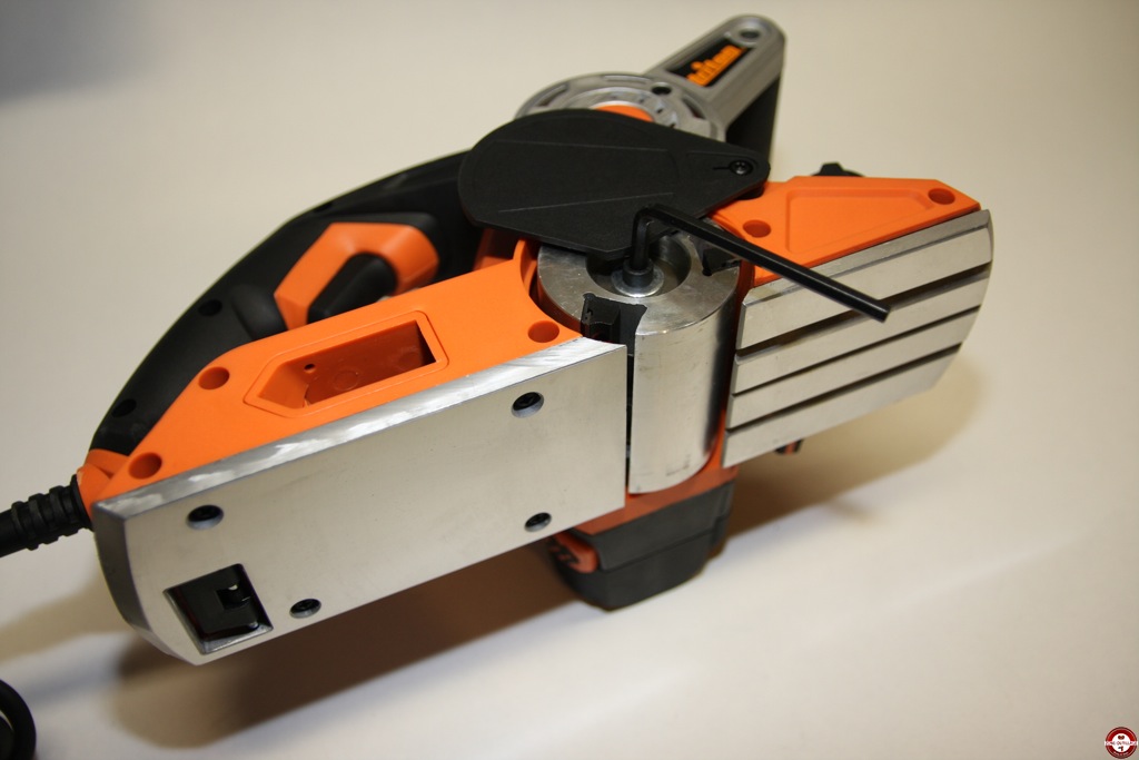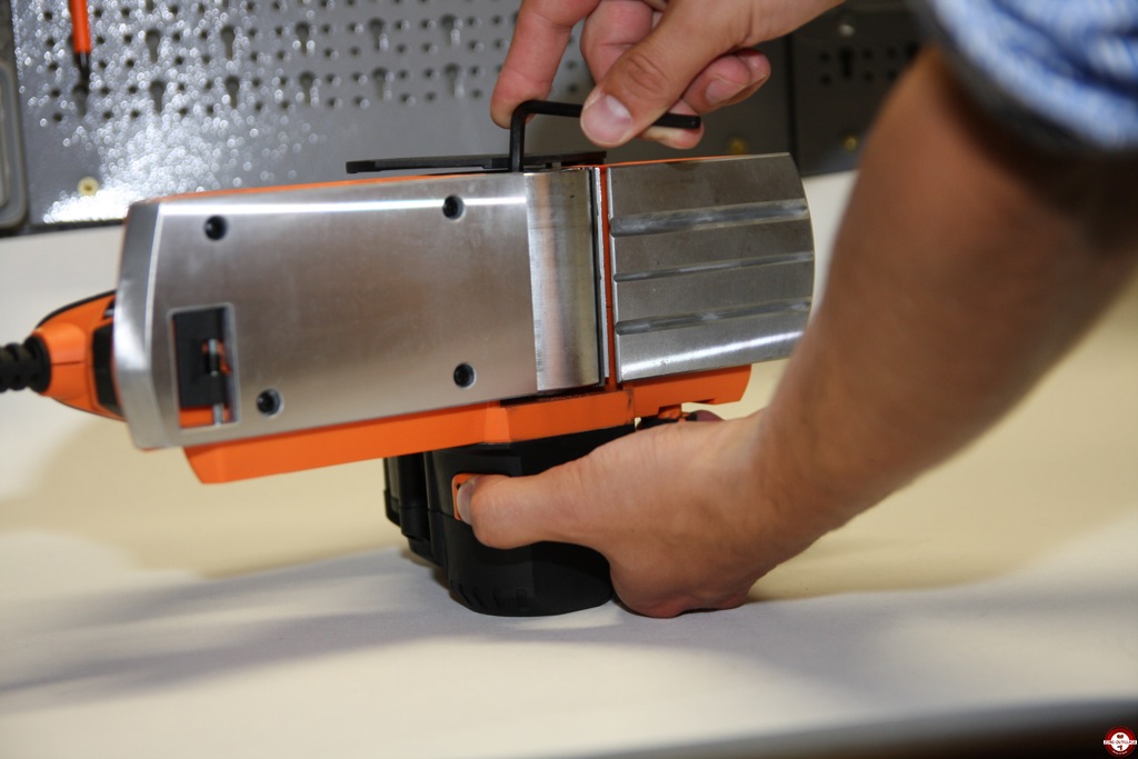 La poignée arrière est recouverte d’un grip, les commandes tombent directement sous la main. Le bouton de réglage de profondeur est situé sur le davant de la machine, il est cranté tous les 0,2 mm. Un variateur de vitesse est disponible sur l’arrière du rabot triton, il vous permet s’adapter la rotation au matériau utilisé.