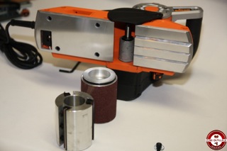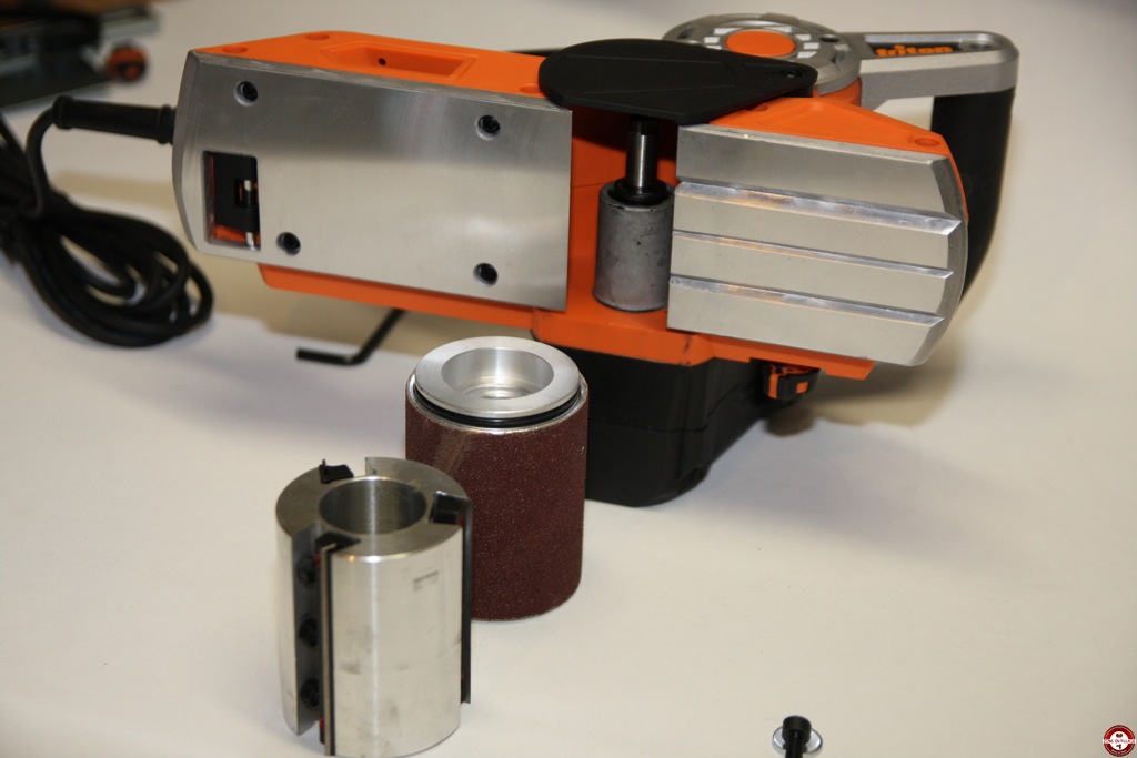 Pour effectuer une feuillure, il faudra vraiment serrer la vis avec force pour obtenir une rigidité parfaite. Le rabot Triton autorise un feuillurage illimité ou total. À l’aide du pouce, il faut maintenir le levier de dégagement pour permettre de relever le dispositif de sureté du tambour et ainsi le tambour sera exposé et permettra de réaliser un feuillurage illimité. Lors de notre test, nous avons constaté que le système d’aspiration des copeaux est perfectible avec le sac. Nous conseillons d’utiliser un aspirateur. Le rabot triton permet d’effectuer des ponçages horizontaux ou verticaux. Le constructeur a fourni un deuxième tambour qui se change facilement à l’aide d’une clé.
