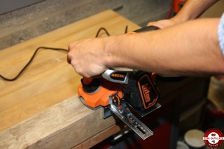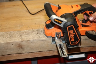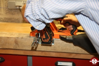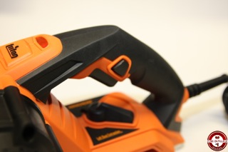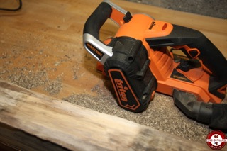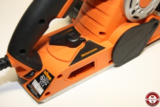 Avant d’utiliser le rabot sur votre pièce, il est préférable de tester sur une chute pour éviter les mauvaises surprises. La mise en marche se fait en deux temps, il faut au préalable appuyer sur le bouton sur le côté pour déverrouiller la gâchette. Le démarrage est progressif et il faut attendre que la machine atteigne son plein régime avant de procéder au rabotage.