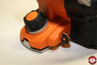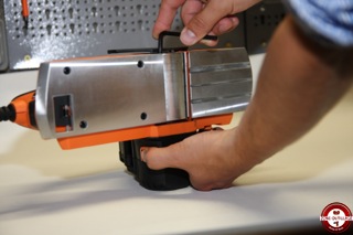 Une molette permet de faire basculer l’éjection des copeaux vers la droite ou la gauche de l’appareil. Le guide parallèle fourni est un peu plus complexe à mettre en place, nous nous sommes référés à la notice qui est claire et en couleur. Le sac d’aspiration se monte en deux temps, un accessoire à insérer dans le rabot puis le sac à adapter dessus. Enfin un témoin lumineux indique la mise sous tension.