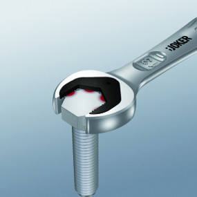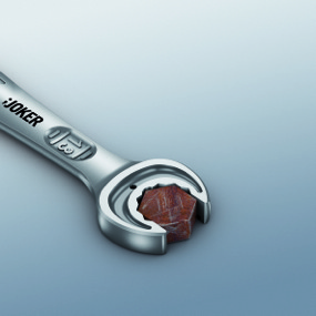 Là où le manque d’espace obligeait jusqu’à présent à retourner X fois les clés conventionnnelles à angle de reprise de 60° pour visser ou desserrer vis ou écrous, « Joker » offre désormais un angle de reprise de 30° avec mécanisme dodécagonal. Grâce à ce nouvel outil, il est possible de desserrer, contre-serrer et serrer vis et écrous dans des situations où les outils classiques échouent.