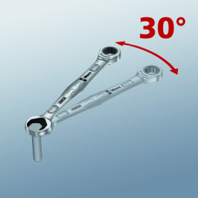 Avec sa fonction de retenue, sa butée terminale, son mécanisme à cliquet et son angle de reprise de 30°, la nouvelle clé mixte à cliquet « Joker » signée Wera surpasse à bien des égards les clés conventionnelles.