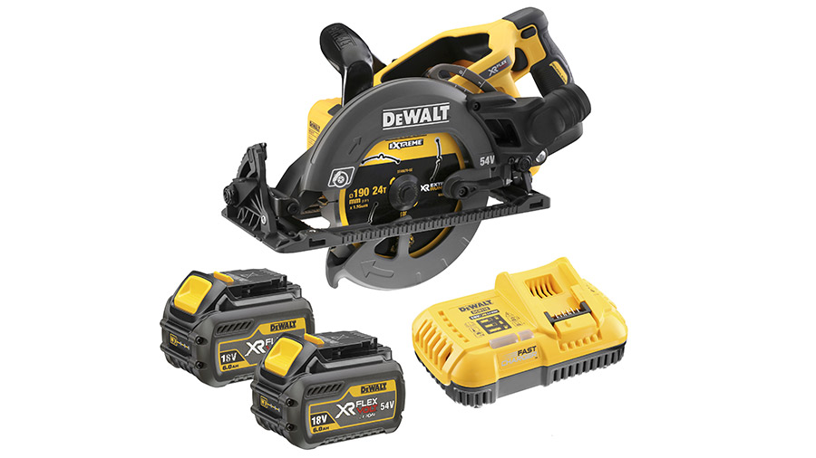 La scie circulaire DCS577 DEWALT va être commercialisée courant septembre 2018 au prix de 599 € HT avec deux batteries DCB546 54V 2,0 Ah et un chargeur rapide.