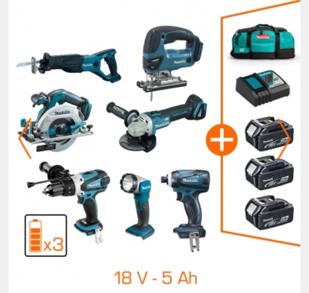 Le pack 6 machines DLX6068PT Makita (1161,43 € TTC) qui comprend perceuse visseuse a percussion DHP453Z, visseuse a chocs DTD152Z, perforateur burineur SDS plus DHR202Z, scie sauteuse DJV180Z, Scie circulaire DSS611Z et lampe torche DML802 - 3 batteries 18V 5Ah Li-ion - Sac de transport - Chargeur pour deux batteries Makita. Plus poyvalent à mon gout avec tous les outils pour les travaux quotidiens et les travaux d'agencement.