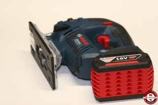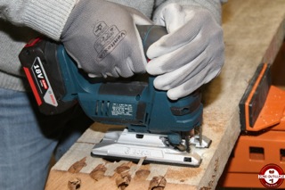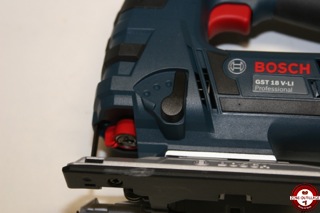 La maniabilité et le confort de la scie sauteuse Bosch GST 18 V-LI sont irréprochables y compris pour les coupes courbes dans les endroits exigus. Le blocage et déblocage de la sécurité se fait d’une seule main. Le changement de lame s’effectue rapidement. Lors de nos tests effectués dans le bois (lames de parquet massif, lames de parquet stratifié, agglo, contreplaqué fin, bastaing…) La machine s’est montrée véloce, nous avons adapté la lame correspondante à chaque type de matériau et le résultat est parfait et sans éclats.