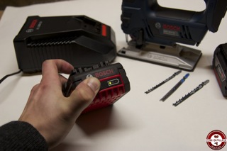 Le système de soufflerie est efficace pour chasser la sciure à mesure. La GST 18 V-LI est alimentée par une batterie dotée de la nouvelle génération CoolPack 18 Volts 4.0Ah, très légère. Par rapport aux anciennes versions 3.0Ah, vous disposez jusqu’à 65% d’autonomie en plus. En usage extrême, la machine est dotée du système EMP (protection électronique du moteur) qui protège le moteur contre les surcharges et sur la batterie, le système ECP (protection électronique des cellules) Bosch qui protège la batterie contre la surcharge, la surchauffe et la décharge totale. Lors de notre test, nous nous sommes déplacés à différents endroits afin d’effectuer les coupes. Quel confort et gain de productivité de ne pas avoir à s’encombrer avec un fil !
