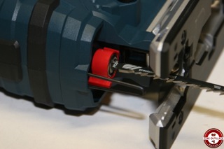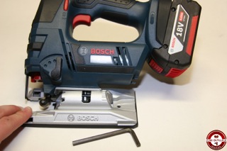 Le réglage de la vitesse se fait avec la gâchette qui fait office d’accélérateur pour passer de 0 à 2 700 coups par minute. Le réglage du mouvement pendulaire se fait sur la partie gauche, vous disposez de 4 positions afin d’adapter la précision. Le montage de la lame s’effectue sans outil, par une simple rotation du système de verrouillage. Une clé hexagonale est située à l’arrière de la machine, elle permet de débloquer la vis qui bloque la semelle, vous choisissez ensuite l’inclinaison de coupe.