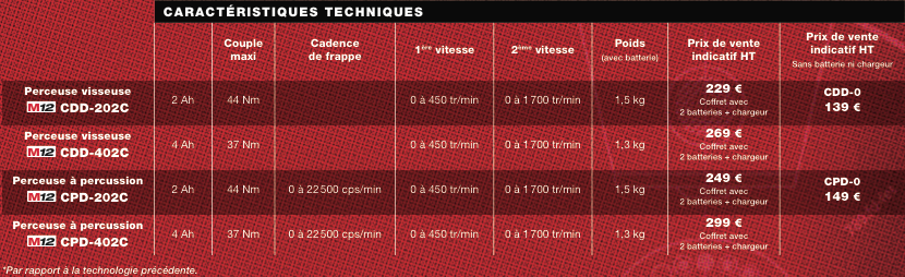 La perceuse visseuse 2 vitesses M12 CDD-202C et la perceuse percussion 2 vitesses M12 CPD-402C se présentent chacune en deux versions : 12 V 2 Ah et 12 V 4 Ah, ce qui permet d’adapter leurs puissances aux différentes utilisations des professionnels.
